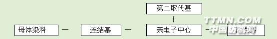 众所周知活性染料是由母体染料、连结基和活性基三部份组成,其中活性基部份又由亲电子中心,活性基和第二取代基组成,活性染料的组成图示如下: