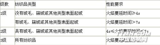 美国的法规。16CFR1610服装纺织品易燃性的标准:该法规规定了服用织物必须经过易燃性试验,并根据易燃性能将织物分为3 个级别:1级为普通易燃性,可做服装;2级为中等易燃性,可做服装;3级为快速和剧烈燃烧,不可做服装。具体要求见表2。表216CFR1615、1616儿童睡衣易燃性标准:该法规要求做儿童睡衣的织物经垂直法试验后,平均损毁长度不超过17.8cm,续燃时间小于10秒。