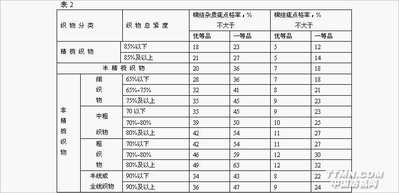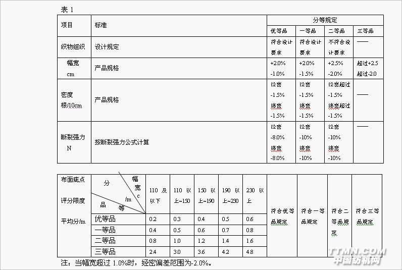 1 主题内容与适用范围 本标准规定了大提花棉本色布的产品品种、规格、技术要求、布面疵点的评分、试验方法、检验规则和标志、包装。 本标准适用于鉴定机织大提花棉本色布的品质。 2 引用标准 GB 3923 机织物断裂强力和断裂伸长的测定(条样法) GB/T 406 棉本色布 GB 4666 机织物长度的测定 GB 4667 机织物幅宽的测定 GB 4668 机织物密度的测定 FZ/T 10004 棉及化纤纯纺、混纺本色布的检验规则 FZ/T 10006 棉及化纤纯纺、混纺本色布棉结杂质疵点格率检验 ZB W04 006.2 温度与回潮率对棉及化纤纯纺、混纺制品断裂强力的修正方法 本色布断裂强力的修正方法 ZB W08 002 棉及化纤纯纺、混纺本色布包装和标志 3 产品品种、规格 大提花棉本色布的品种、规格,根据用户需要,由生产部门按技术条件的规定制订。 4 技术要求 4.1 技术要求项目 技术要求项目有织物组织、幅宽、密度、断裂强力、棉结杂质疵点格率、棉结疵点格布面疵点七项。 4.2 分等规定 4.2.1 大提花棉本色布的品等分为优等品、一等品、二等品和三等品,低于三等品的为等外品。 4.2.2 大提花棉本色布的评等以匹为单位,织物组织、幅宽、布面疵点按匹评等,密度、断裂强力、棉结杂质疵点按批评等,以其中那个最低一项品等作为该匹布的品等。 4.2.3 分等规定见表1和表2。.jpg)