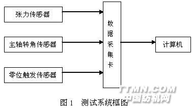 以前,纬纱张力的测试多采用动态电阻应变仪,利用光线示波器进行记录,工作复杂,且结果精度和准确性难以令人满意[2]。文献[3]提出对纺纱张力测试采用应变电桥、自制放大电路、数据采集卡、计算机、VB编程实现,具有简单、准确、通用等特点。此方法也可用于纬纱张力测试,但需要自己设计硬件电路,电路参数调整不方便,灵活性较差,且VB编写仪器界面不是很好。本文针对上述问题介绍一种基于虚拟仪器的测试新方法,该方法具有建立系统快、简单、可靠、通用性强、界面友好等特点。 1 系统组成 图1为测试系统框图,主要由传感器、数据采集卡、计算机及相应软件组成。