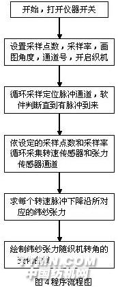 数据采集卡实现将传感器输出的电压信号转变为数字量,此数字量送给计算机,编程实现数据读取与保存。本系统采用美国NI(NationalInstrument)公司基于计算机PCI插槽的多路模拟输入采集卡,12位A/D转换,最高采样频率可达200kHz。目前,喷气织机的一般转速为500-1500r/min,纬纱张力变化频率为8.3-25kHz。本次使用中采样率选择100kHz,数据采集卡本身集成放大电路和A/D转换,具有可编程选择放大倍数,用户无需自制放大电路,故测量系统建立快、测量精度高,测量时将转速传感器、定位传感器、张力传感器的输出分别接至采集卡的三路模拟输入通道。