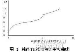 1 中和法分析THPC的原理在THPC水溶液中,THPC会离解成THP、甲醛和氢离子:(HOCH2)4PCl → (HOCH2)4P+ + Cl- (2)(HOCH2)4P+ → (HOCH2)3P + CH2O + H+ (3) 在纯净的THPC溶液中,发现用NaOH滴定时pH值有突跃变化,突跃范围是8-10,滴定曲线如图(2)所示: