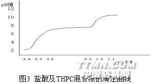 图3 盐酸及THPC混合液的滴定曲线 图(3)中pH值有两个突跃范围:pH 1.5-3.5和pH 8-10,由此可分别选用甲基橙和酚酞作指示剂,测出盐酸浓度及总酸度,最终测算出THPC的浓度。