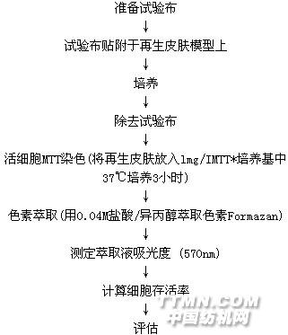 三、再生皮肤刺激性试验法 抗菌整理纺织品对人体皮肤刺激性试验,改由人皮细胞培养成再生皮肤模型上进行,以计算细胞存活率作为刺激性评估,其方法概要如下: