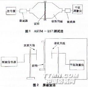 1 织物屏蔽效能的测试目前对织物屏蔽效能的测试一般采用平面材料的电磁辐射屏蔽效能的测试方法,常用的有:ASTM— ES7 测试法