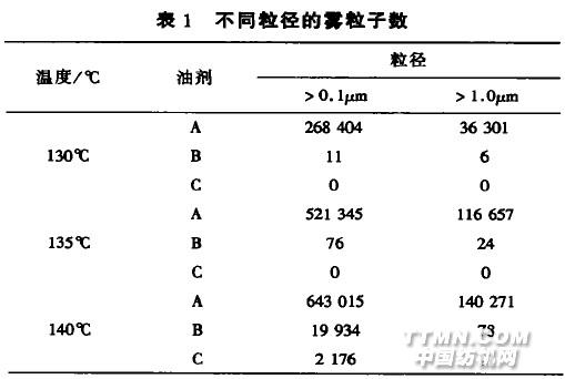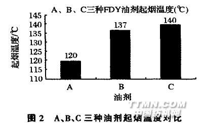 从上述结果可以看出,A油剂发烟性能较差,B油剂发烟性能较好,C油剂发烟性能最好。A油剂在125℃ 时已产生较多烟雾粒子数,而且烟雾粒子数随温度升高迅速增加。B在ldO~C才开始有烟雾粒子数产生,而C在140~C时烟雾粒子数很少。见图2所示。
