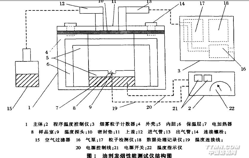 化纤油剂是化纤生产过程中不可缺少的重要助剂。油剂发烟是由于纤维需在较高温度条件下加工生产,因油剂耐热性不好而导致油剂热分解挥发而产生烟雾。油剂发烟不仅影响生产加工顺利进行,而且污染了现场作业环境。目前考察油剂发烟性能好坏,主要是通过肉眼观察,即观察油剂在恒温热板上发烟情况,这种方法主观随意性大,不能够精确定量表征。另外也有借助于热失重来考察油剂发烟性能的,这种方法能反映油剂的失重,但不能表征油剂的发烟情况。本文通过测试一定量的油剂在一定时间内和一定温度下产生的不同粒径烟雾粒子数多少来精确表征油剂的发烟性能,进而指导油剂的评价选用和配方设计。1 实验部分1.1 实验原料A、B、C三种化纤油剂。1.2 实验仪器油剂发烟性能测试装置(仪化研究院自制),见图1所示。1.3 实验方法量取A、B、C三种油剂各2 L,计量在130~C、135℃ 、140℃下1 min内产生的粒径>0.1 p.m的烟雾粒子数和测定三种油剂的起烟温度。2 结果与讨论2.1 油剂发烟性能测试装置原理将定量油剂样品置于可以调控温度的系统中,然后加热升温使其产生烟雾,在保证补偿空气净化的前提下,将产生的烟雾粒子抽吸到检测仪中检测,通过计量某一温度下一段时间内产生不同粒径烟雾粒子数来表征油剂发烟性能。油剂发烟性能测试装置主要设备有:测试装置主体、程序升温控制仪和烟雾粒子计量器。2.2 油剂发烟性能测试结果表1为2ul A、B、C三种FDY油剂在130℃ 、140℃下于1 min内产生的不同粒径雾粒子数对比。