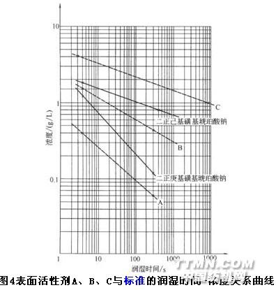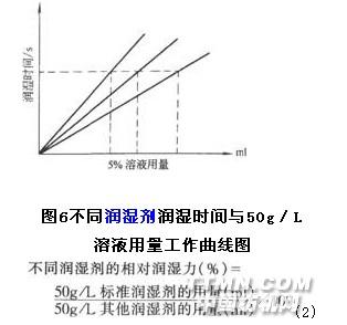 2.不同品种试样的相对润湿力测定根据配制的不同用量的5%试样溶液和润湿时间,绘制工作曲线(见图6)。每一种试样可作一相应曲线。在图中找出相同润湿时间下,各润湿剂所对应的用量。以某一润湿剂为标准,按式(2)求出它们的相对润湿力