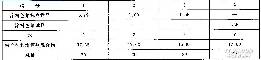 (单位:克)6.1.3 印花操作在 平 整 的玻璃版上铺好呢毡和衬布(洁净的纸类亦可),然后将织物(大小与网版所留布样位置相同)铺在上面将绢网版按在布样上,将配制后的涂料色浆标准样品及试样分别倒人网版的两个槽内,用橡胶刮板将槽内色浆按三等分由上刮下,然后取下布样置于洁净纸上(为第一版)。再铺好织物,将网版左右调换位置,将剩余的色浆分三次刮下,取下布样置于洁净纸上(为第二版),置于800C烘箱内烘干或晾干。用印花机印花,参照印花机的使用说明进行。6. 1.4 色光和粉色力的评定按 G B/ T 2374-1994中第6章的规定进行。6.2 颗粒细度的测定按 HG / T 3400-2001的规定进行,为适应涂料色浆的具体特点,做以下规定。a) 放 大倍数10 00倍(目镜lox物镜100);b) 统 一称取涂料0.5 g (精确至。.0 1g ),配制后立即测定;c) 测 试结果的表述,以每个视野内大于若干(X)微米的颗粒数表示。X值视具体品种而定。6.3 试验报告试 验 报 告包括以下内容:a) 被 测涂料色浆的名称;b) 测 试项目;c) 本 标准编号、年代号;a) MI 试方法;e) 使 用仪器的名称、型号;f) 测 试结果;9) 在 测试过程中的特殊情况;h) 与 本方法的差异;i) 试 验日期。配 浆 时 按表7规定称取标准样品及试样(精确至。.0 005 g )置于50m L烧杯中,然后移到药架托盘天平上加水2.0 g,搅拌均匀后再加人按表1配好的粘合剂和增稠剂的混合物(粘合剂和增