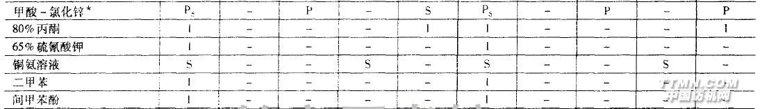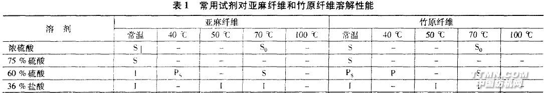 用此种方法,关键是能找到一种合适的溶剂,能把竹原纤维溶解掉而对亚麻纤维损伤不大,或者将亚麻纤维溶解掉而对竹原纤维损伤不大。常用的2O余种溶剂对两种纤维的溶解性能见表l。