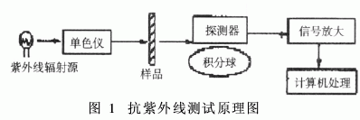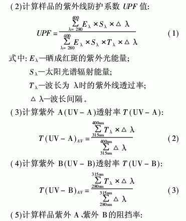 在图1中紫外线辐射源为测试提供充足且稳定的紫外线辐射能量,经单色仪将辐射源的紫外线辐射能量色散后,进行光谱测量;积分球可计算出由样品射出的所有方向,包括直射和漫射的光谱辐射通量;探测器由光电倍增管组成,将积分球收集的信号经放大和处理后,输入计算机,进行信号的最后处理。1.2 测试方法每个待测试样至少取两个样品进行测试,样品尺寸至少为50mm×50mm的正方形或直径至少为50mm的圆形,不同颜色、不同组织结构应该分开测试,并将样品按照ASTMD1776中规定的条件平衡(温度为21±1℃,相对湿度为65%±2%)。1.2.1 干态样品抗紫外线性能测试通过仪器可以检测出样品的紫外线透过率,将样品正面朝向UV光源,在同一个点上测试3次,第2次以第1次为基准旋转45°角测试,第3次为在第2次的基础上旋转45°角测试。1.2.2 湿态样品抗紫外线性能测试当需要测试湿态样品的抗紫外线性能时,需要先将样品称量,再放入烧杯中加入一定量的蒸馏水浸没30min,并不时挤压样品使其充分浸湿,使样品含湿率达到150%±5%。测试方法同干态样品。1.3 计算方法(1)将3次测试结果取平均值得到每块样品的平均紫外线透过率。(2)计算样品的紫外线防护系数UPF值: