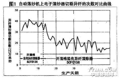 如果没有开清棉对原棉纤维清除异纤的装备,而只在自动络纱机上配有异纤电子清纱器(如图1所示),自动络纱机由于清除带有异纤的纱切断频率很高,会严重影响自动络纱机生产效率,也不会彻底清除异纤。 因此,必须将这两种清除异纤的技术联合起来,才能首尾相顾,产生比较理想的清除异纤的效果。以特吕茨勒公司生产的SCFO156清纤机与电子清纱器作用的配合为例,(图1所示)为自动络纱机上异纤清纱机切断异纤纱的次数对比(装与不装清除异纤系统)。 开清棉生产线未端加装了异纤检测及清除系统,棉絮经风扇(2-6)送进清纤系统后首先在2-1处被清除灰尘及短绒,而后进入异纤检测及分离排除区,被清除的异纤的棉纤维经(2-6风扇)被送往喂入梳棉机或双棉箱给棉系统。清除异纤的基本原理是将束状棉纤维及包缠了异纤的束状纤维首先要经过细致的开松,开松越好,束纤维越少,呈游离状的单纤维状态越好,异纤被检测清除的可能性越大,SCFO清除异纤系统安装在开清棉生产线末端及梳棉机之前。
