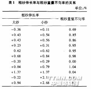 粗纱自前罗拉输出至筒管的过程中,必须克服锭翼顶端、空心臂和压掌等机件对粗纱的摩擦力。为使卷绕正常,实际上筒管的卷绕速度要比前罗拉输出速度稍大,使粗纱在卷绕过程中始终保持一定的紧张程度,这种紧张程度称为粗纱张力。粗纱张力测试与调整对于保证粗纱工序在大、中、小纱的纺纱过程中,减少粗纱意外牵伸、保证粗纱条干、控制重量不匀率、保持成形良好、改善粗纱的内在质量,提高后工序成纱质量具有重要意义。1 粗纱张力对粗纱及成纱质量的影响 保持一定的粗纱张力是纺纱工艺的必然要求,这是因为适当的粗纱张力有利于提高纱条中纤维的伸直度和紧密度,并使卷绕成形紧密,容量增加。粗纱张力太小时就会造成前罗拉和锭翼间的纱条因松弛而断头,纱管卷绕松软,形成烂纱;粗纱张力过大时,会引起纤维间相对滑移而使条干不匀和断头增加。 粗纱是半成品,其质量指标主要包括重量不匀率、条干不匀率和粗纱伸长率。虽然影响粗纱质量的因素很多,但在粗纱工序既影响条干不匀又影响重量不匀的主要因素却是粗纱张力。这既不同于并条工序,也有别于细纱工序,具有自身的特殊性。其原因在于:一是粗纱截面的纤维根数比棉条少,而捻度又远比细纱低,所以经受较大张力后容易产生意外伸长,使条干均匀度恶化,断头增加;二是卷绕过程中,粗纱的张力大小难免存在着差异(如台与台之间,同台前后排之间,大、中、小纱之间和锭与锭之间),当差异过大时,即影响了粗纱的重量不匀,从而增加了细纱重量不匀与重量偏差。粗纱伸长率与粗纱重量不匀率的关系如表l所示。