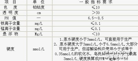 印染用水由于水源不同,水质质量也不一样。一般南方的水硬度低,而北方的水硬度很大,目前小型染整加工厂众多,但不是所有的染厂都有能力自己进行水处理(包括清水处理和污水处理),有些染整用水是天然地表水或地下水或自来水,污水则采用集中处理排放的方式。 从印染质量角度考虑,一般认为符合一定的水质要求是应该的,尤其是生产高品质产品时更有必要。多年染厂经验:影响染色质量的水质因素——色度、PH值、铁离子含量、锰离子含量、硬度(钙镁离子含量)一般建议采用符合下表水质要求的水: 印 染 用 水 水 质 要 求