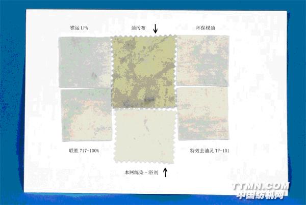 1、测评样品: A.特效去油灵TF101 (本网) B.环 保 枧 油 (本网) C.低 泡 练 染 一浴剂 (本网) D. 联胜717-100%环保低泡精练剂 E.雅运多功能乳化分散剂LPA 2、测试方法及大致过程: 测试助剂对油污去除效果,油污布样来自于织布厂,上面有老化、破乳的针织油,有设备润滑油(擦过设备),有黑色皮鞋油(擦过皮鞋);处理工艺:同比进行,用不同的去油助剂2g/L,98℃×20′,热洗一次,水洗烘干;然后用电脑测配色测定白度值; 3、结果: (布样图片、白度值):助剂 白度值 空白污布样 45.56 A特 效 去 油 灵TF101 (本网) 57.89 B环 保 枧 油 (本网) 56.74 C低 泡 练 染 一浴剂 (本网) 59.33 D联胜717-100%环保低泡精练剂 56.86 E雅运多功能乳化分散剂LPA 54.18