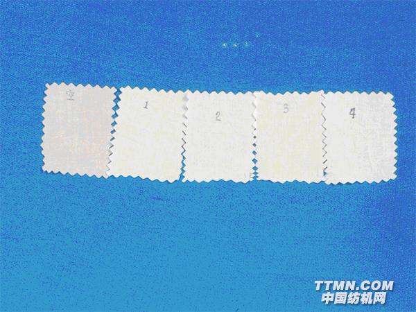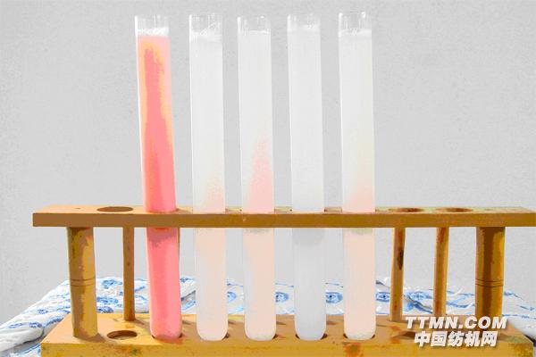 色变评述:△E中深色在0.8以下属正常可调范围;(△E就是色差值) 翠蓝:2#上海大祥300DX , 色变严重超标△E 1.89,4#无 甲 醛 固 色 剂300DX(本网)△E 0.82,是可容忍范围,1#、3#相对较小,翠蓝整体变化都 大,△E都在0.6左右; 大红:都不超标,在允许范围内,3#、1#较小(小→大顺序3#、1#、4#、2#); 3、固色时固色浴落色情况 翠蓝——2#落色较重,3#最轻,其次是4#、1# 大红——落色都较轻,3#、1#略深 4、皂洗牢度测试: 上述染色处方的染色物(翠兰、大红),在皂洗机中进行皂洗测试,4.0g/L皂片、2.0g/L纯碱,60℃×30min;贴衬白细布做沾色实验,并收集皂洗残液,留有照片; 结果: 翠兰:白沾布图片