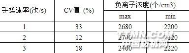 表1中结果可知,在2次/s时所测试数据的CⅤ值最小,表明数据波动小,即测试结果最稳定。b)手搓速率恒定条件下时问对负离子发射量的影响:选择以相同速率2次/s手搓A织物,分别在不同时间点记下其负离子发射量,每个时间点测试5次,然后计算每个时问点的5个数据的cV值,CV值越小的表明其波动越小,即测试结果越稳定。根据一般的手搓实验条件,取10s、⒛s和30s三个时间点进行测试,其CV值计算结果如表2所示。表2手搓时间测试结果CV值