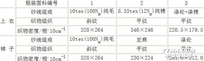 2 舒适性人体穿着实验2.1 实验样品 实验用服装是按上衣和裤子配套穿着的,款式按军需部JSB52-93、JSB54-93部颁标准制作3号三型服装。详细规格及配套情况见表1。表1 实验样品及编号