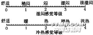 注:3号上衣经纱为300d涤纶多重多异变形丝,纬纱为涤/棉混纺纱65/35; 3号裤子经纬纱都是多重多异空变丝。2.2 主要实验仪器 人工气候仓:温度5~40℃,±1℃;湿度30%~90%,±3%;有效空间为1.6m×2.5m×2m。 人体秤:量程为150kg±2g;精密电子秤:(3000±0.1)g。 衣内微气候测量仪[3]:用来测量服装内微气候区的温度、湿度以及人体皮肤温度等指标。仪器测量的指标有:皮肤温度、体核温度、微气候区的温度和相对湿度、环境温度和环境湿度以及心率。温度测头有22个,湿度测头6个,数据采集周期15 s。仪器的测量范围:温度为0~40℃,±0.1℃;相对湿度为10%~95%,±3%。2.3 测量指标2.3.1 基本测量指标 主观感觉指标:冷暖感、湿闷感2种感觉等级分级方法。其详细描述见图1。