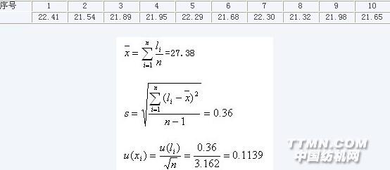 1.4不确定度来源 1)重复性测试引起的不确定度 2) 环境温湿度的影响所引起的不确定度 3) 标准物质校准引起的不确定度1.5不确定度分量的评定 1.5.1测试过程随机效应导致的不确定度 对同一个棉花样品的10个试验试样进行测试,测定的上半部平均长度值如表1。表1 上半部平均长度测试结果