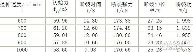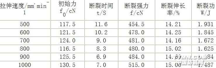 《纺织材料学》(纺织工业出版社,第2版,高等纺织院校教材)第359—379页讲述的“纤维、纱线断裂机理”,概括起来就是“施加给纤维、纱线的拉伸力破坏了纤维、纱线的内在结构,导致了纤维、纱线的断裂”。我对此表示怀疑。 请看实验:调节纱线强力仪的拉伸速度,记录:初始力f0;断裂强力f;断裂时间t;断裂伸长率L;并粗略计算断裂功W。实验1(见表1):表1 实验1测试数据