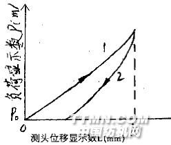 图二 弯曲滞后曲线(三)压缩特性测试:主要是评定织物的厚实性,膨松性和压缩回复性。测试过程如图四所示,将单层试样1平放在试样台9上,开动电源测头3即以定速下降,测量轻、重二种压强时所产生的厚度差和卸负后所具有的回复量,以计算试样的厚实性, 膨松性、和压缩回复性。表观厚度(即轻压强作用下测得的厚度)大,织物手感较膨松,稳定厚度(即重压强作用下测得的厚度)大,织物手感较厚实,压缩弹性率大,织物在服用中丰厚性的保持能力较好。