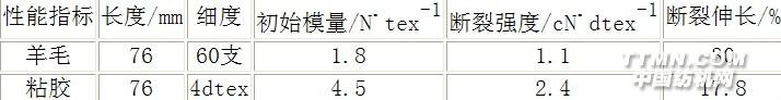 2 实验2.1 实验用原料(见表1)表1 羊毛、粘胶的物理指标