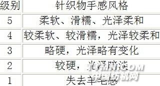 2.2 织物设计 用羊毛与粘胶以不同混纺比按精纺工艺流程纺成毛纱及混纺毛纱,再并捻成为双股线,股线支数为20.83×2tex(48/2Nm),股线拈度为202捻/m,在横机上织成纬平组织的针织物,线圈密度为:纵向——76圈/10cm,横向——56圈/10cm。2.3 测试方法2.3.1 起毛起球的测试 试样在YG502型织物起毛起球仪上测试,测试结果见图1。2.3.2 手感风格的测定 通过目测手摸等方式对试样的硬挺度、光滑性、光泽等进行综合感观评定织物手感风格后,将纯毛织物试样的手感风格值定义为5级,评定标准见表2,测定结果见图2。表2 针织物