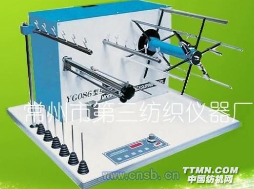Model YG086C Measuring Reel Tester 用于将纱线管上试样纱线用纱框摇取缕纱,供纱线的线密度(或支数)的测定及缕纱强度试验等用。性能符合GB/T4743-1995《纱线线密度的测定 绞纱法》。 Used to rock skein by reel from sample yarn in bobbin for measurement of linear density (or count)test of skein strength. The properties shoukd be in conformity with the requirement specified in GB/T4743-1995 "Determination of yarn density: Method of reeled yarn". 主要技术参数:Main Technical Data 1、可同时试验纱管 Number of bobbin to tested at the same time: 6 2、纱框周长 Circumference of reel YG086C:1000mm +/-1mm YG086E:54 in +/-16 in (出口专用for export only) 3、摇纱横动往复宽度 Transverse width of skein 35mm 4、单根摇纱张力范围 Tensile range of single skein 0~100cN 5、外形尺寸 Outline size L780*W660*H480mm