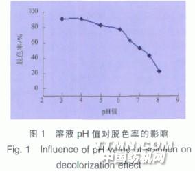 固定搅拌时间为8 min、离心时间为10 min、投土量为20 g/L,改变溶液pH值,按1.3节的方法处理染料废水,考查不 同溶液pH值对脱色效果的影响。结果见图1。