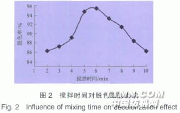 由图2可知,当搅拌时间为6 min时,脱色效果最好;搅 拌时间小于6 min,改性壳聚糖膨润土与染料分子接触不充 分,吸附量未达到饱和;超过6 min,由于搅拌时间过长,使已 被吸附的染料分子发生脱附,影响了脱色率。由此可以看出, 其吸附主要为表面吸附。选择最佳搅拌时间为6 min。