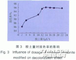 由图3可知,当投土量小于14 g/L时,脱色率随投土量的增加而逐渐增大;当投土量达到14 g/L时,改性壳聚糖膨润土对染料分子的吸附达到饱和,此时脱色率最大;而当加入量过高,超过14 g/L时,脱色效果基本趋于稳定。从经济角度考虑,宜选择投土量为14 g/L。
