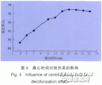 由图4可知,随着离心时间的增加,脱色率增大;当离心 时间达到17 min后,脱色率不随离心时间的变化而变化,基 本趋于稳定状态。本试验最佳离心时间为17 min。