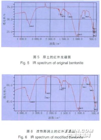 经测定,原土的比表面积为37.124 6 m2/g,改性壳聚糖膨润土的比表面积为56.277 8 m2/g,并对原土和改性土进行了 扫描电镜(3 000倍)和红外光谱分析,结果见图5~图8。 由图5和图6可见,3 434 cm-1和1 627 cm-1附近出现较强的吸收,是膨润土表面吸附水和层间结构水的振动带, 3 434 cm-1为蒙脱石结构中层间吸附水的—OH伸缩振