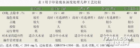 据南京嘉庆科技实业有限公司在多家综合性印染厂运行入硅藻土净水设备,将经生化处理后的废水(CODcr为140 ~ 210 Mg/L)进入硅藻土净水设备,出水CODcr 为60 ~ 90 Mg/L,去除率为40 % ~ 66.6 %,这是一般物化工艺很难达到的。印染废水经过系列处理后,最后余下的污染物很难降解,一般深度处理工艺的CODcr 去除率<30 %。对几种印染废水深度处理工艺的效果进行比较,结果如表1所示。