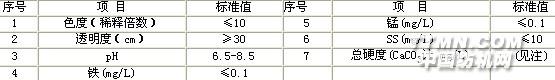 注:1)原水硬度小于150mg/L可全部用于生产;2)原水硬度在150-325 mg/L之间,大部分可用于生产,但溶解性染料应使用小于或等于17.5mg/L的软水,皂洗或碱液用水硬度最高为150mg/L;