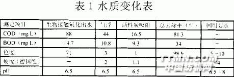 1 印染废水回用处理技术的现状一直以来由于印染废水本身难处理的特性,人们对印染废水深度处理回用方面没有引起足够的重视。加入W TO后,随着我国纺织印染行业的势头逐步看好,纺织印染行业用水的需求量不断增大,而供给量却相对减少;随着排放标准的日趋严格和水费的不断上涨,人们将目光投向印染废水深度处理和回用上。由于印染工艺本身的复杂性和工艺用水水质要求的差异,目前国家对印染废水的回用水质标准还没有统一的数据。近年来人们对印染废水深度处理的工艺从技术和经济的可行性上都进行了大量探索、分析和实践,取得了可喜的环境效益和经济效益。目前出现的印染废水深度处理组合方案主要有以下几种:。1.1 印染废水→生化出水→混凝→气浮→砂滤→活性炭吸附→回用该方案完全是物化技术的组合,何文杰等用此方案深度处理某毛纺厂经生物接触氧化法处理后的出水( 水质变化见表1)。经接触氧化池的出水已经能够达标排放,但废水中残留的染料通常以胶体状态存在,该方案能够较有针对性地去除胶体物质,使出水达到回用要求。Giovanni的研究也得出了相似的结