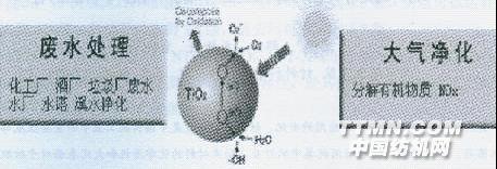 图一、纳米二氧化钛(Ti02)催化活性示意图 纳米材料的催化剂在纺织工业中有诸多应用实例。例如,纳米氧化锌、纳米二氧化钛对于水中的卤代脂肪烃、染料,硝基芳烃、取代苯胺、多环芳烃、杂环芳烃化合物,烃类,酚类、表面活性剂,农药等都能有效的进行光催化反应,通过除毒、脱色、矿化,最终分解为二氧化碳和水,从而消除有机物对环境的污染。不仅如此,纳米二氧化钛对水中的重金属离子有很强的还原能力,通过光催化可使85%的六价铬被还原,这在实际应用中对处理含铬废水有着重要意义。