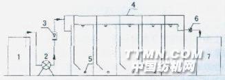 图1 ABR试验装置示意 1-进水桶;2-迸水泵;3-玻璃转子流量计;4-ABR反应器;5-排泥口;6-阀门;7-排水桶 厌氧折流式反应器的有效容积为7.2 m3,分为5个隔室。设计处理水量为0.2~0.5 m3/h,水力停留时问(HRT)可控制在14~36 h。每室由一个下流室和一个上流室组成,上流室与下流室的宽度比为4:1。通往上流室的挡板下部边缘有45°倒角的导流板布水,便于将水送至上流室的中心,使泥水充分混合,维持较高的污泥浓度。每室顶部设有取样口,进水从进水箱由进水泵打入ABR反应器中,通过调节流量计来保证系统进水的恒定。1.2试验水质 处理水质取自江苏省常熟市梅李污水处理有限公司调节池。该公司污水处理设计能力为