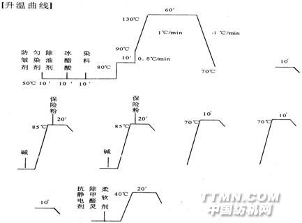 涤纶针织物的染色,传统方式都是在高温高压染缸中完成的。针织物的绳状湿处理方法,普遍存在能源和水资源消耗大,产量低,布面容易折皱等问题。同时,生产厂家为了节约用水,提高产能在染色后,还原清洗的次(道)数,能省就省,造成洗水牢度的品质也难以保障。针对这些弊端,我们在研究针织物对张力敏感容易变形和容易卷边的基础上,有针对性的开发出了适合于针织物湿处理的平幅水洗机。经过应用厂家实践,取得了比较明显的经济效益和社会效益。1 传统涤纶针织物高温高压染色流程如下: