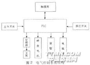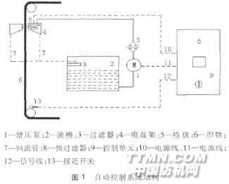 增压泵1抽取液槽2中的液体或水,通过过滤器 3输送到喷盘架4上安装的各个喷盘5中。当平幅运 行的织物6通过时,液体便以雾状喷射其上。未被喷射 到织物上的液体则通过回流管7流回到液槽。通过预 过滤器8清除回流液体中的杂质。控制单元9根据布 速控制喷液量及其他相关器件,电源线10连接喷盘电机,当其得电时电机运行,使喷盘高速旋转喷出雾状液 体。电源线11连接增压泵,当其得电时增压泵运行,信 号线12一边与接近开关13相连,另一边向控制单元 9输入织物移动速度开关量信号。 电气控制系统的结构框图见图2。触摸屏用来输 入湿度设定值