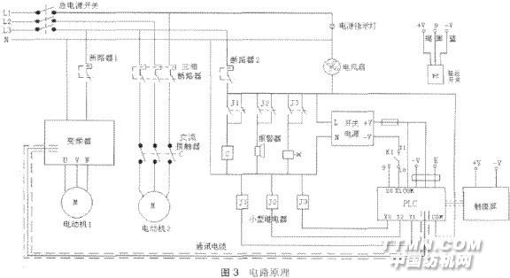 2控制系统电路及工作原理 控制系统电路的核心器件为触摸屏、可编程控制 器、变频器,其电路原理如图3所示。