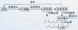 1 印染废水中非水资源的回收利用1.1 PVA浆料 PVA即聚乙烯醇,是一种重要的上浆剂,具有优良的成膜性和粘附性,且易与其它浆料相容。由于其上浆性能优于淀粉及变性淀粉,因此广泛用于纯棉高密织物及涤棉混纺织物的经纱上浆。退浆废水中一般含有1%左右的PVA浆料,若不进行处理,将会造成环境污染。但PVA浆料难以生物降解,一般的生化处理去除率很低。用超滤装置处理退浆废水,PVA大分子被膜阻拦,水分子则透过膜,调整PVA浓缩液至合适的浓度后可重新用于上浆,透过的清水可回用于退浆。据估算,一台车速为100 m/min的织物生产装置,采用超滤膜回收PVA浆料后,每天可节约6 000美元。该方法的具体流程见图1。