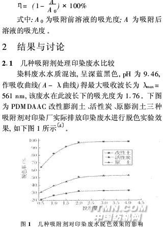 印染废水〔1〕具有颜色深,COD、BOD值较高,组 成复杂多变,分布面广等特点。目前常用的处理方 法有化学沉淀法、双氧水处理法、生物法和吸附法 等,其中吸附法主要用于预处理和深度处理。吸附 法主要有活性炭、生物活性炭、硅藻土、膨润土吸附 等。膨润土〔2〕吸处理印染废水的方法不仅简便、有 效而且成本低。另外,聚二甲基二烯丙基氯化铵 (PDMDAAC)在水处理方面有沉降性很高、絮凝剂 用量少、脱色效果显著等优点〔2〕,在水处理领域应 用广泛。因此,本文尝试采用PDMDAAC和H2SO4 溶液改性膨润土,提高其在处理印染废水方面的吸 附性能,并取得了较好效果。