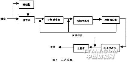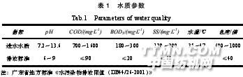经济的高速发展使社会分工越来越专业化,在国家产业 和环保政策的引导下,各种各样工业园区快速兴起。如电镀 工业园、纺织印染工业园、食品工业园、电子信息工业园、 化工工业园等。工业园区的废水大都是集中治理模式,它具 有比分散治理更低的总基建投资、更低的运行管理费用、更 专业化的操作维护管理等优点。不仅让园区的企业减轻负 担,也给管理者带来了方便。 但是园区的企业种类不同、产 品不同、生产工艺的差异化等也给集中处理带来一定的技术 难题。如纺织印染工业园,有制衣厂、染整厂、印花厂、染料厂等,排出的废水水质、水量因此也是差别较大[1-2]。 中山市高平织染水处理有限公司处理工业园区20多家 纺织印染厂排放的废水,设计总处理规模为3×104 m3/d,分 三期建设。目前一期设计规模为1×104 m3/d,已投入运营, 目前日均处理量在9000 m3左右。该废水具有有机污染物含 量高、色度高、碱性大、硫化物含量高、水温高、水质水量 变化大等特点,且可生化性差,属难处理的工业废水之一, 企业的订单及季节性生产也使水质参数产生较大变化。其水 质变化参数范围如表1所示。