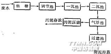 二、处理工艺印染废水与其它生产环节排水分流排出, 其中印染废水由地下污水管经格栅进入调节池, 用泵提升至沉淀池, 经过初沉淀和二次沉淀后,上清液自流进入气浮池, 同时投加定量碱式氯化铝[Al2(OH)2Cl0~n]m (n= 1~5, m≤10)。废水在气浮池中通过加压溶气酌吸附作用和碱式氯化铝(絮凝剂)的絮凝网捕作用,使絮凝物上浮后与水分离,清水引入平流式过滤池(以焦炭为滤料),利用物理吸附进一步去除悬浮物和其它有害物后排放。由气浮池排出的污泥,脱水后经压滤系统压成泥饼堆存。废水处理工艺过程如图2。