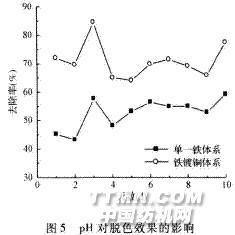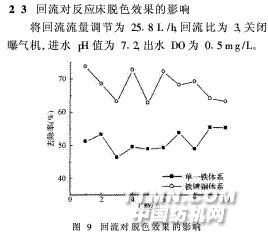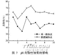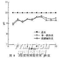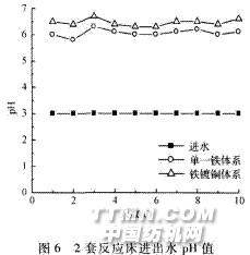 由图7可知,在碱性条件下,单一铁滤料体系脱色率下降,平均脱色率为45·7%。而铁镀铜滤料体 系脱色效果也有下降,平均脱色率为63·8%,仍比 单一铁滤料体系高出18%。从以上2个试验可知 在酸性和碱性条件下,铁镀铜内电解体系对酸性红 B的脱色效果均好于单一铁内电解体系。从图6和 图8可知, 2套反应床的出水pH值均较为稳定,能 适应进水水质波动,减少对后续生物处理的冲击。.jpg)