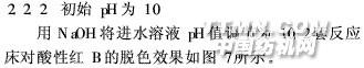 用硫酸将进水溶液pH值调为3, 2套反应床对 酸性红B的脱色效果如图5所示。从图5可知,铁 镀铜滤料体系与单一铁滤料体系分别运行10 d,前 者对酸性红B的脱色率一直高于后者。前者平均 脱色率达70·9%,后者仅为52·6%。并且, 2套反 应床的脱色率比2. 1节中相应的脱色率均有所提 高。这是由于在低pH值时,因有大量的H+加速反 应的进行和Fe2+的溶出,增强了对酸性红B去除作 用。从图中还可看出,在pH值较低的情况下,铁镀 铜内电解体系具有更强的脱色能力。.jpg)