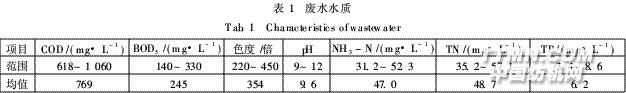 由表1可知,该废水水质波动较大, pH呈碱性 BOD5/COD值在0. 26左右,废水的可生化性较差 NH3-N和TN浓度较典型印染废水的要高,主要原 因是有一家印染企业在印花工段大量使用了尿素。 1·3 测试项目与方法 COD:重铬酸钾法; BOD5:稀释与接种法;色度 稀释倍数法;NH3-N:纳氏试剂比色法; pH: pH计 MLSS、MLVSS:重量法; DO、温度:便携式DO仪;生 物相:光学显微镜;有机物成分:气质联用。 1·4 接种污泥