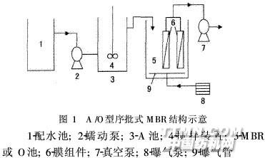 0 前言 印染废水是难处理的工业废水之一,具有组分复 杂、有机物含量高、色度深、化学需氧量(COD)高和生 化需氧量(BOD5)低等特点[1]。面对2008年1月1日 起实施的《太湖地区城镇污水处理厂及重点工业行业 主要水污染物排放限值》(DB 32/T 1072—2007)和水 资源短缺的现状,很多现有的印染废水处理工艺已无 法满足达标排放和回用要求。因此,开发高效可行的 印染废水处理新工艺势在必行。 膜生物反应器(Membrane Bioreactor,MBR)技术将 物理技术与生物处理技术相组合,具有剩余污泥产量 低(甚至为零),占地面积小,出水水质好,可直接回用 等优点,且膜对难降解大分子有机物和专属功能微生 物还有截留作用,因而对难降解有机废水的处理效果 明显优于传统工艺。 近年来,采用膜生物反应器处理印染废水的研究 越来越多。王文浪等[2]的研究表明,水解酸化处理+ MBR组合工艺处理印染废水,COD去除率可达90%以 上,脱色率为82%,且水解酸化处理为后续MBR工艺 创造了良好条件。程刚等[3]采用A/O型序批式MBR 处理印染废水,出水COD≤100 mg/L,色度为2 ~ 16倍,浊度≈0,悬浮固体(SS)≈0,效果良好。采用 MBR处理印染废水的研究报道,大多数集中于处理效 果,涉及膜污染方面的内容不多,针对MBR应用中出 现的膜污染问题的解决措施更是甚少。 序批式MBR技术借鉴了序批式活性污泥法的运 行方式,由传统MBR工艺演变而来。由于其在MBR 反应器前增加了水解酸化即兼氧处理单元,因此在此 简称为A/O型序批式MBR工艺。该技术在保留传统 MBR技术优点的基础上,通过增加水解酸化和序批式 运行,提供了厌氧/兼氧-好氧交替环境,为难降解有机 物的去除创造了有利环境,